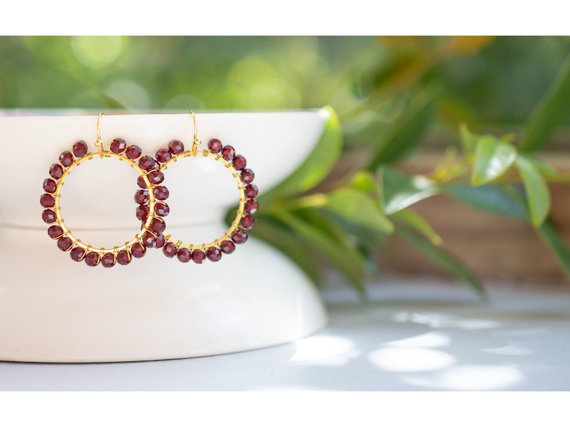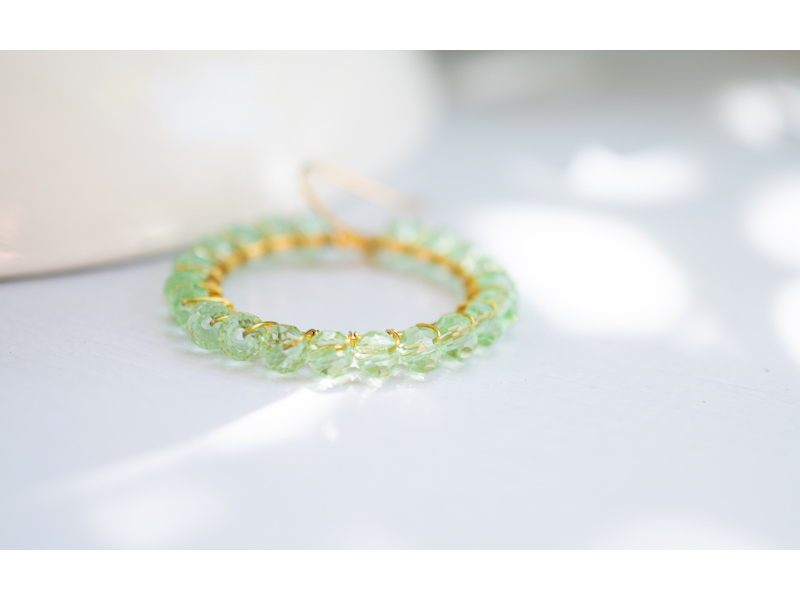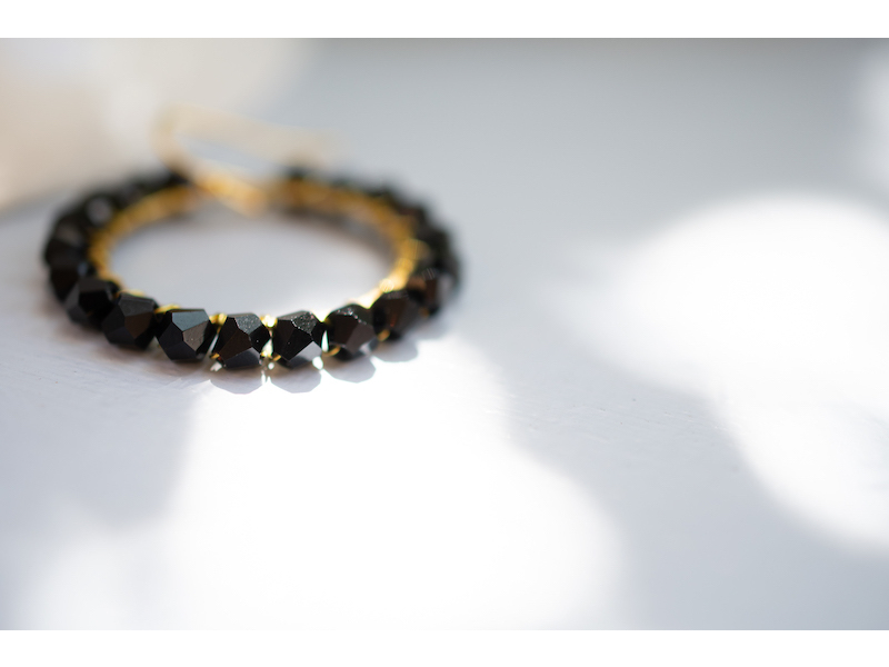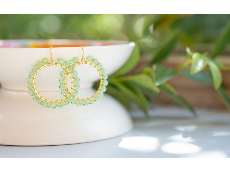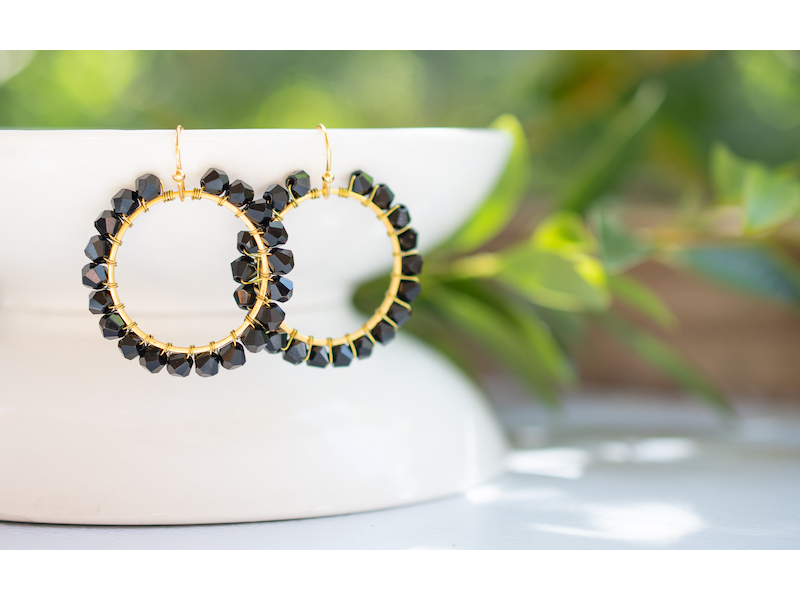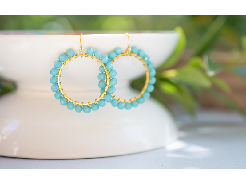 Approximately 2.5cm diameter gold plated hoops, wire wrapped with 4mm crystal beads. Nickel free earring hooks. Please wear and store your earrings with care. Your jewellery will last better if removed before you swim, sleep or shower. Fragrance and body lotion may cause discolouration. Please get in touch with us for more colour variations.