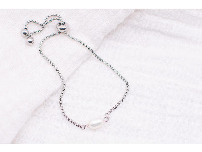 We added a faux pearl to this trendy stainless steel drawstring bracelet.